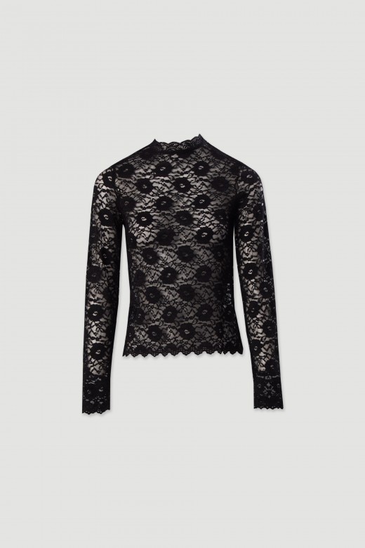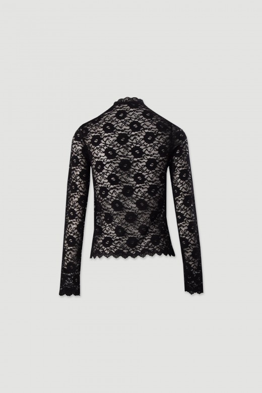 - Descrição e MedidasCamisola em renda delicada, que combina feminilidade e sofisticação. Apresenta gola alta trabalhada e mangas compridas, criando um visual elegante e intemporal. Os acabamentos ondulados na barra e nos punhos acrescentam um toque romântico, enquanto a transparência sutil valoriza a peça com charme e modernidade.